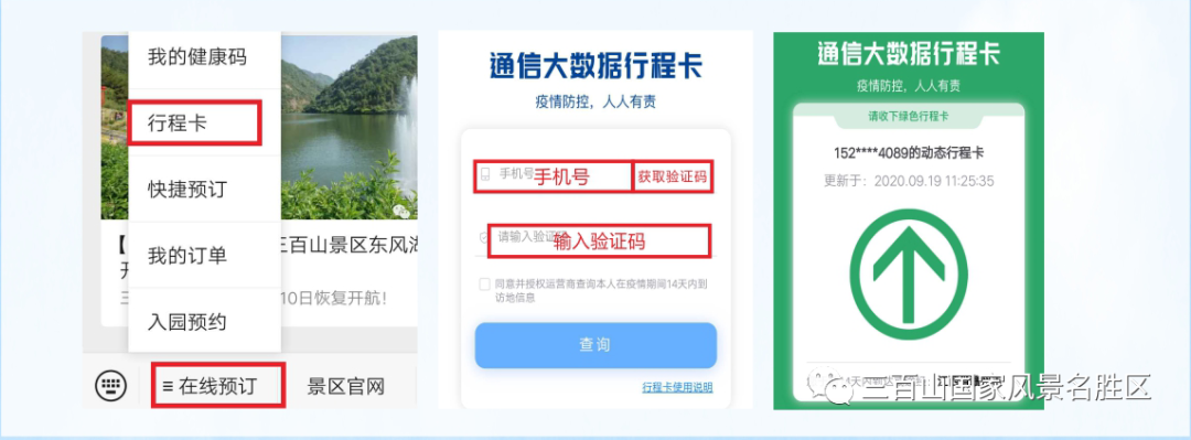 关注公众号→在线预订→行程卡→输入手机号及验证码→出示绿色行程卡。