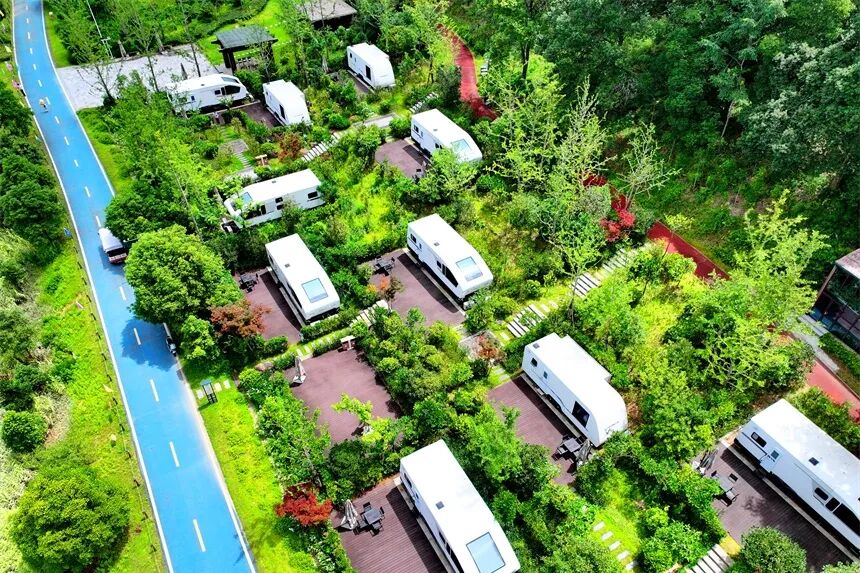캠핑장의 총 면적은 약 360 무로 별자리에 따라 이름이 붙여졌으며 5개의 캠핑장으로 나뉘고 각종 기능의 캠핑카 53대와 20채의 특색 미수가 있다.동시에, 야영지 내에 고급 통나무집 리셉션센터, 통나무집 별장, 오락광장, 음악카페, 잉추이후 낚시 등 부대시설이 갖추어져 있어, 동시에 200여명이 묵을 수 있고 관련 관광 서비스를 제공할 수 있다.