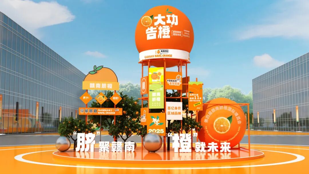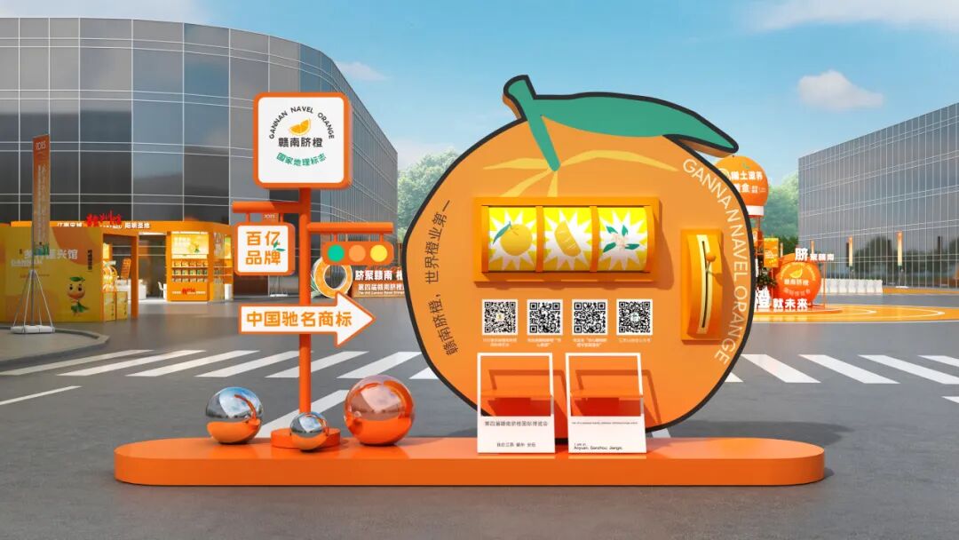 中心C位打卡!巨型脐橙热气球甜度爆表!绿植环绕间,产业优势与品质标签如“金字招牌”层层绽放,既诉说着赣南脐橙的天然生态,也彰显着“世界橙乡”的硬核实力。